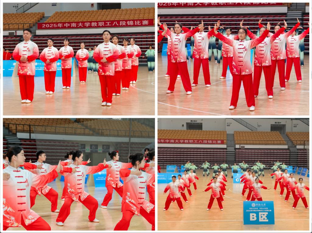 上午9时30分,随着裁判长一声清脆哨响,比赛正式拉开帷幕。我院代表队身着统一服装,迈着整齐的步伐,身姿挺拔、精神饱满地步入赛场。伴随着悠扬舒缓的音乐,队员们迅速进入状态,动作舒展流畅,一招一式精准到位——起势、托举、俯身、展臂……每一式都沉稳有力、整齐划一。从“两手托天理三焦”到“背后七颠百病消”,既展现出八段锦刚柔并济、形神兼备的功法精髓,又彰显出学院教职工积极向上、锐意进取的精神风貌,赢得了现场观众与评委的一致认可。