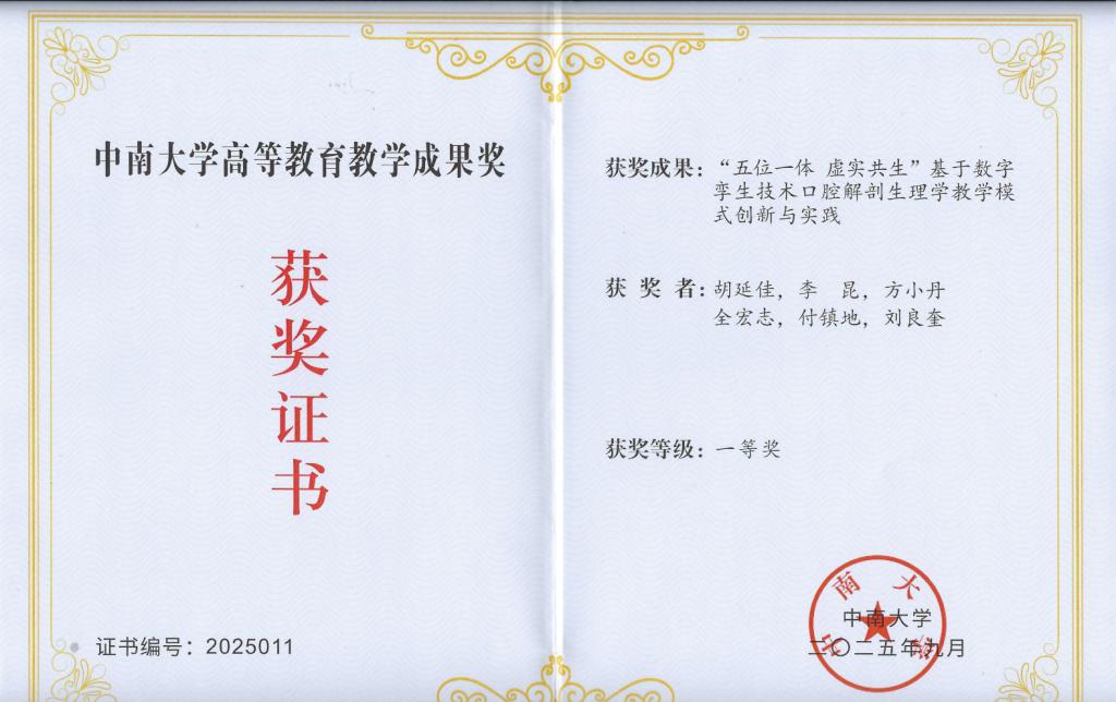 11月14日,600全讯白菜官方网站公布教学成果奖评选结果,由我院口腔解剖生理学教研室胡延佳教授团队申报的《“五位一体、虚实共生”口腔解剖生理学教学模式创新与实践》项目荣获一等奖。该项目在数字化教学改革方面取得重要突破,为口腔医学人才培养提供了新范式。